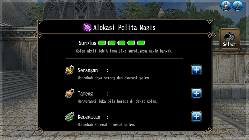 | Peningkat Kecepatan | Mengupgrade pelita magis untuk meningkatkan kecepatan. Kecepatan Aksi bertambah untuk tiap pelita yang dialokasikan ke Kecepatan. |